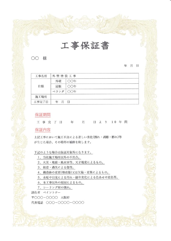 最初の塗装完工後、「保証書」をご送付いたします。